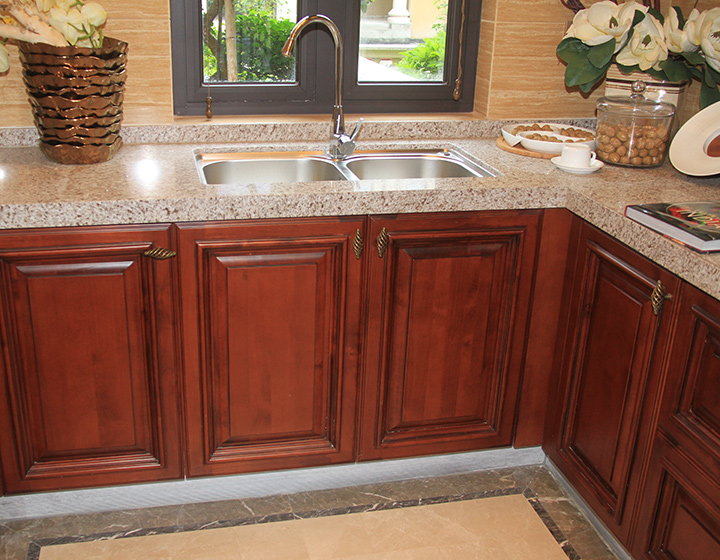 2、實(shí)木復(fù)合櫥柜以實(shí)木拼接料為基材,表面貼實(shí)木皮,同樣能達(dá)到實(shí)木的視覺(jué)效果;