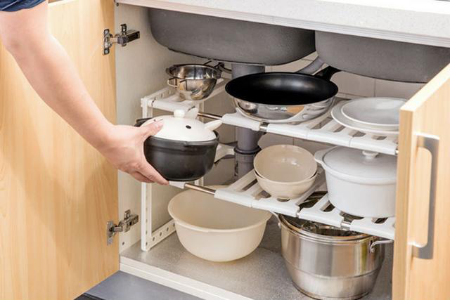 3、下水道置物架:其實(shí)廚房往往也有我們忽略的地方 ,例如廚房水槽下方管道的地方,空置下來(lái)著實(shí)無(wú)比浪費(fèi),在這里我們可以選擇一個(gè)下水道置物架,平日里也可以收納一些儲(chǔ)物罐,或是使用頻率不高的鍋具!