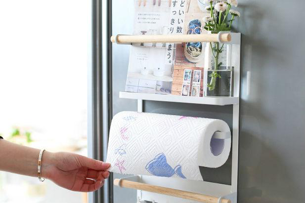 4、冰箱側(cè)邊置物架:我們可以在冰箱外側(cè)掛上置物架,放上我們平常使用的保鮮膜保鮮袋等等,十分適合日常的拿??!