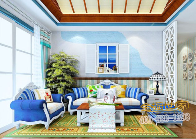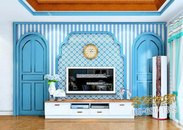 藍白相間的色調(diào)給人藍天白云的感覺,適合用在客廳。沙發(fā)的顏色搭配也有講究,必須選擇與電視墻顏色搭配的天藍色或者是原木色。