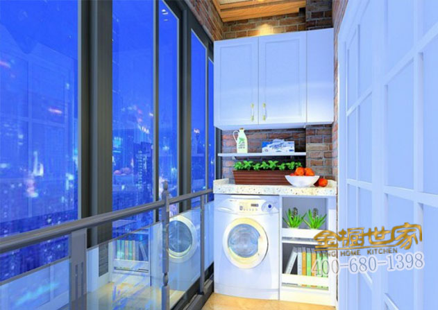 陽臺的空間雖然是小,但依然可以變得十分漂亮,洗衣區(qū)可以設置在陽臺,再加上一個吊柜儲物,簡潔實用。許多人總是怕陽臺經(jīng)常受風吹日曬雨淋,但只要加上一個推拉玻璃門就能解決這個問題。