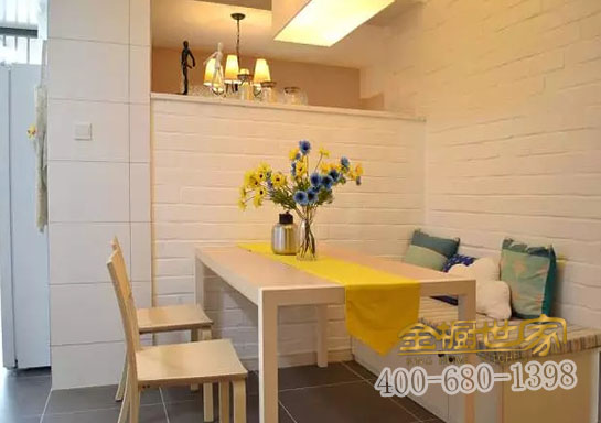 小清新范的卡座設(shè)計,周末的時候約上三五好友,或聊天,或品茶,是一種享受。餐廳再小,也應(yīng)該有個吃飯的餐桌,單排卡座餐桌靈活性大,可以是客廳也可以是餐廳。