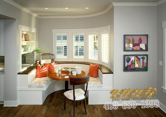 L型卡座柜,對于人口較多或者經(jīng)常有客人的家庭來說,非常適合,比起單獨(dú)的椅子,這樣的設(shè)計無形中增加了1-3個座位,同時還增加儲物空間。